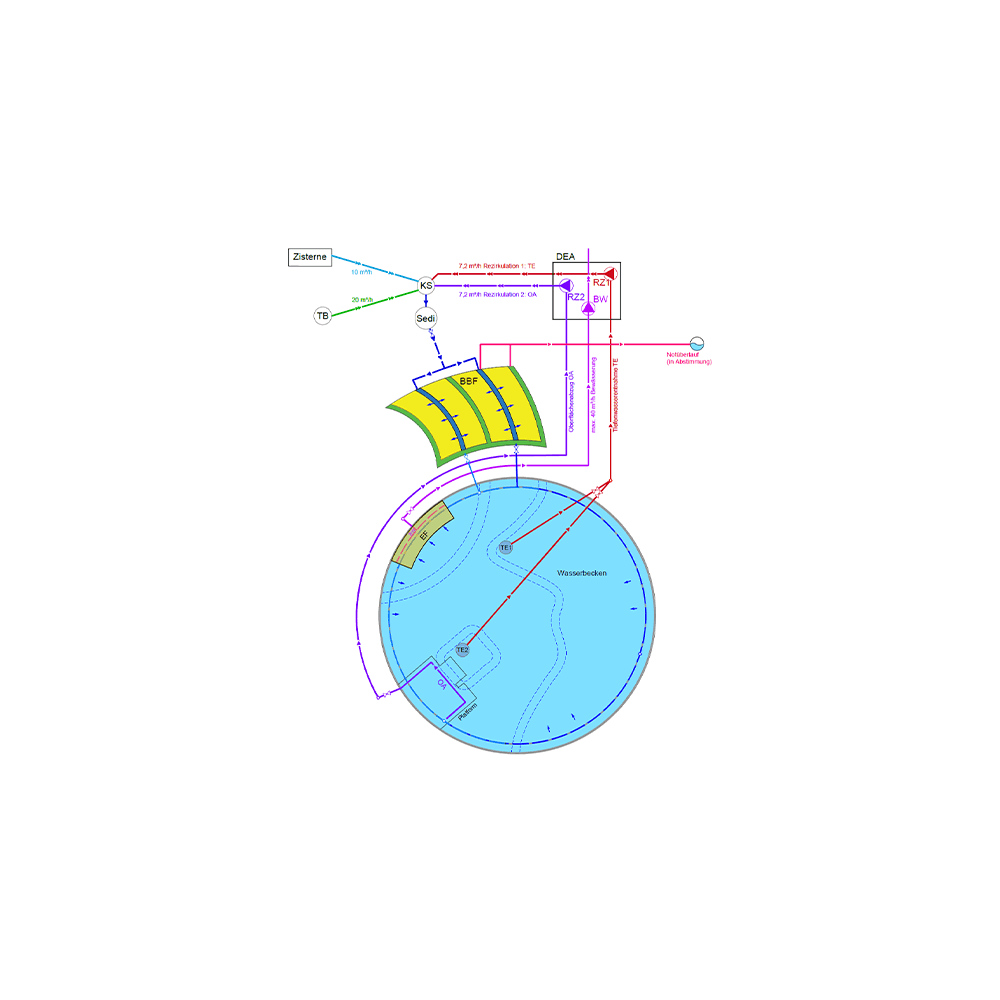 Sammlung und Nachspeisung des Wasserbeckens mit gereinigtem Niederschlagswasser