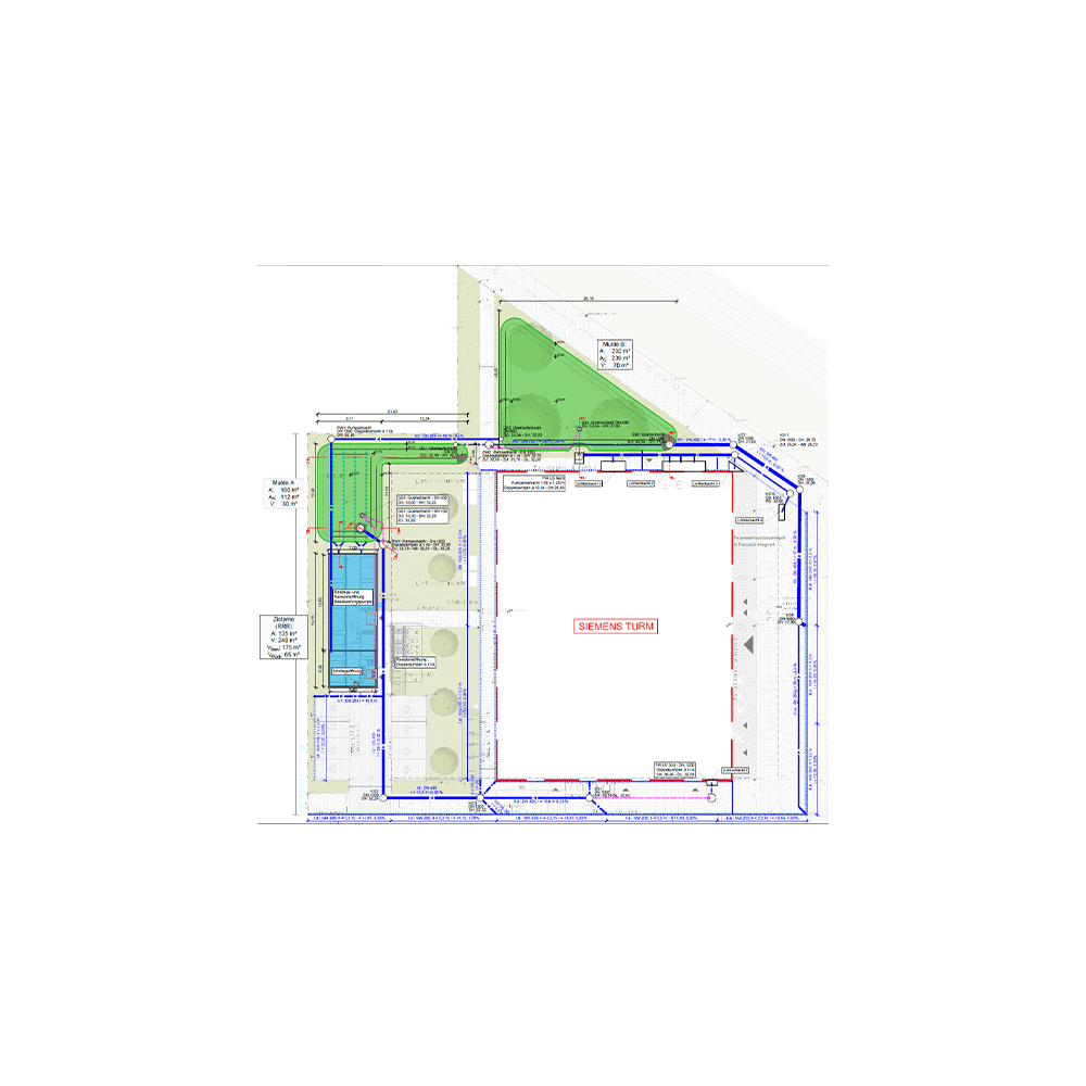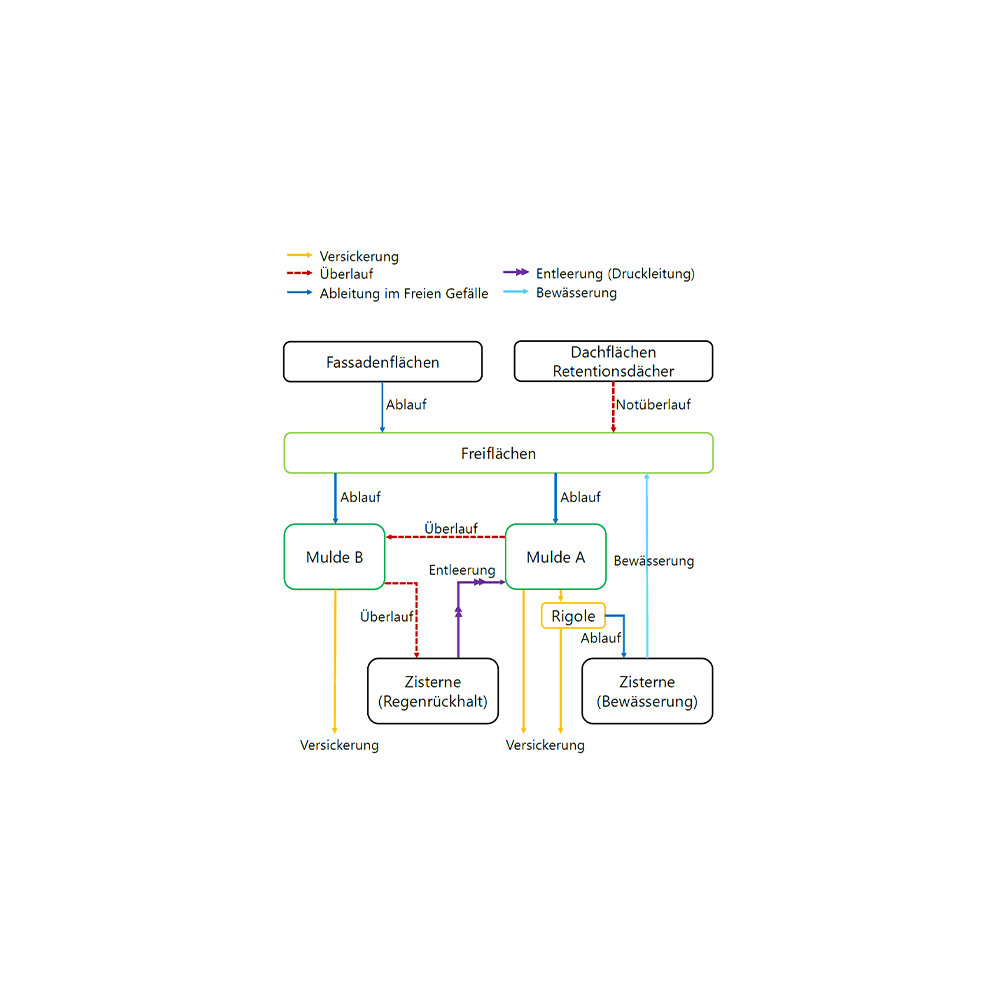 Retention und Versickerung des anfallenden Niederschlagswassers der Freiflächen, Dachflächen und der Fassaden sowie öffentlichen Flächen (1,3 ha) auf privatem Grundstück